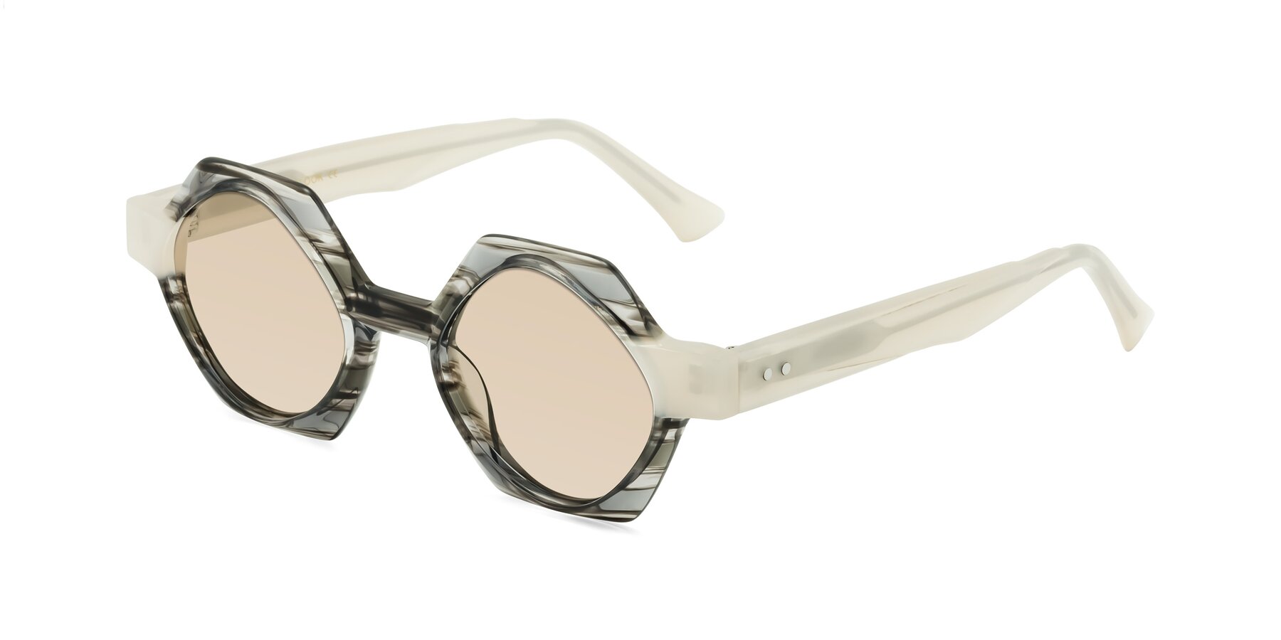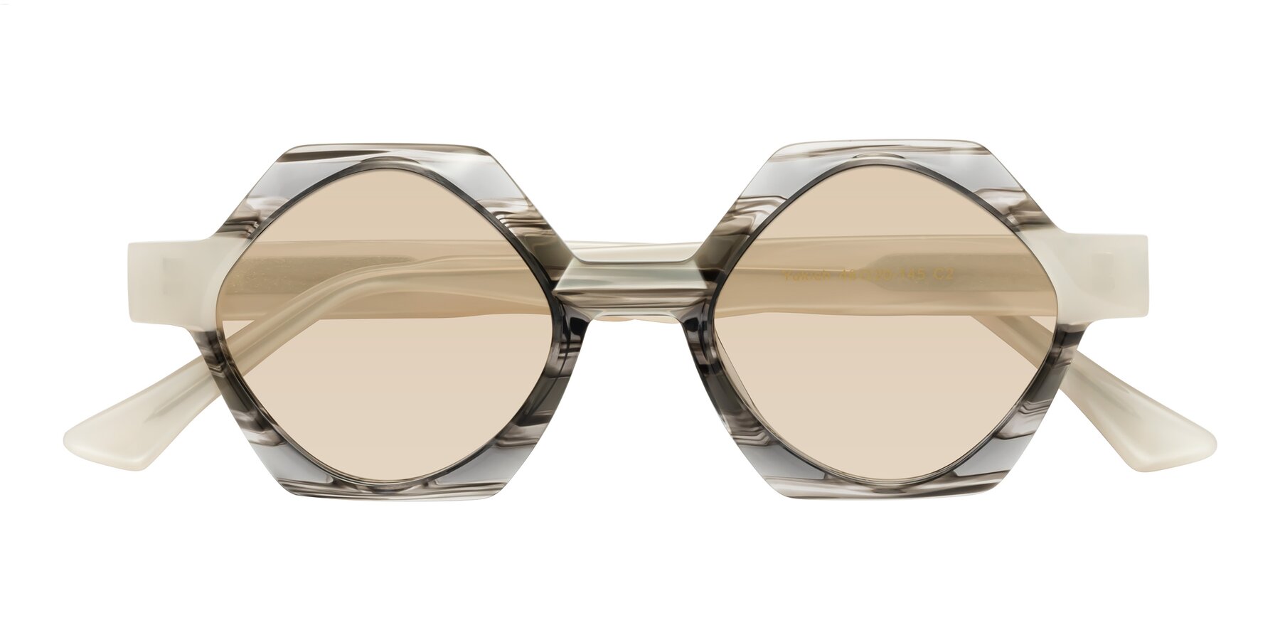 Gray Striped Designer Round Geometric Tinted Sunglasses with Light Brown Sunwear Lenses