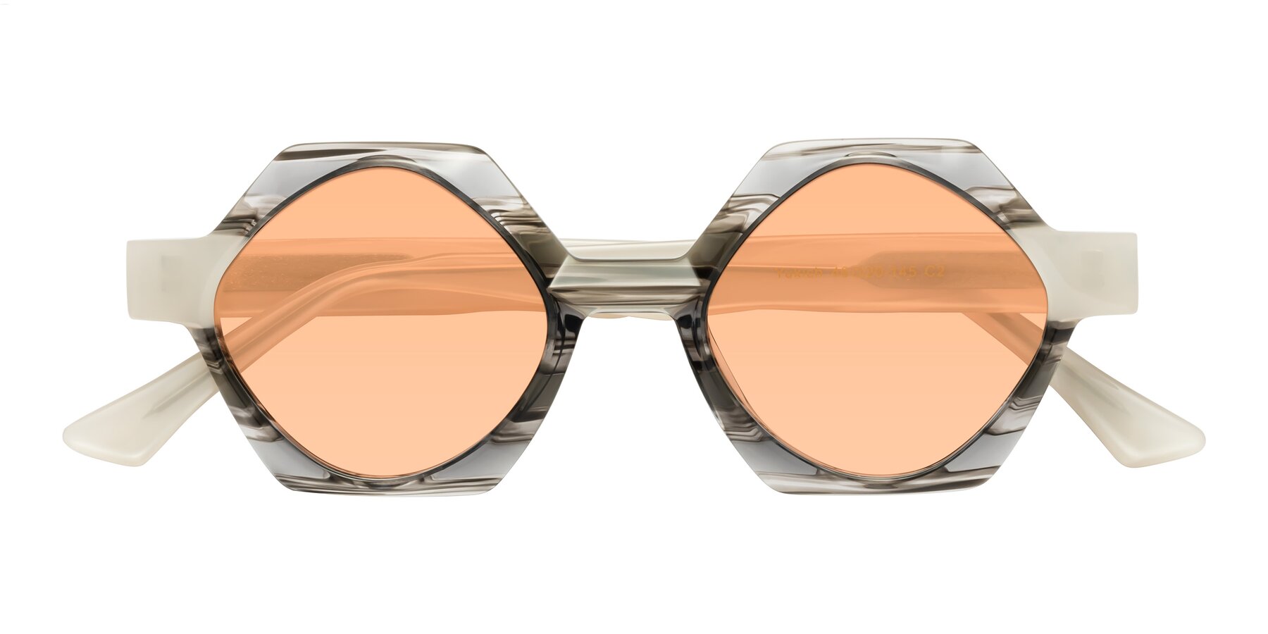 Gray Striped Designer Round Geometric Tinted Sunglasses with Light Orange Sunwear Lenses