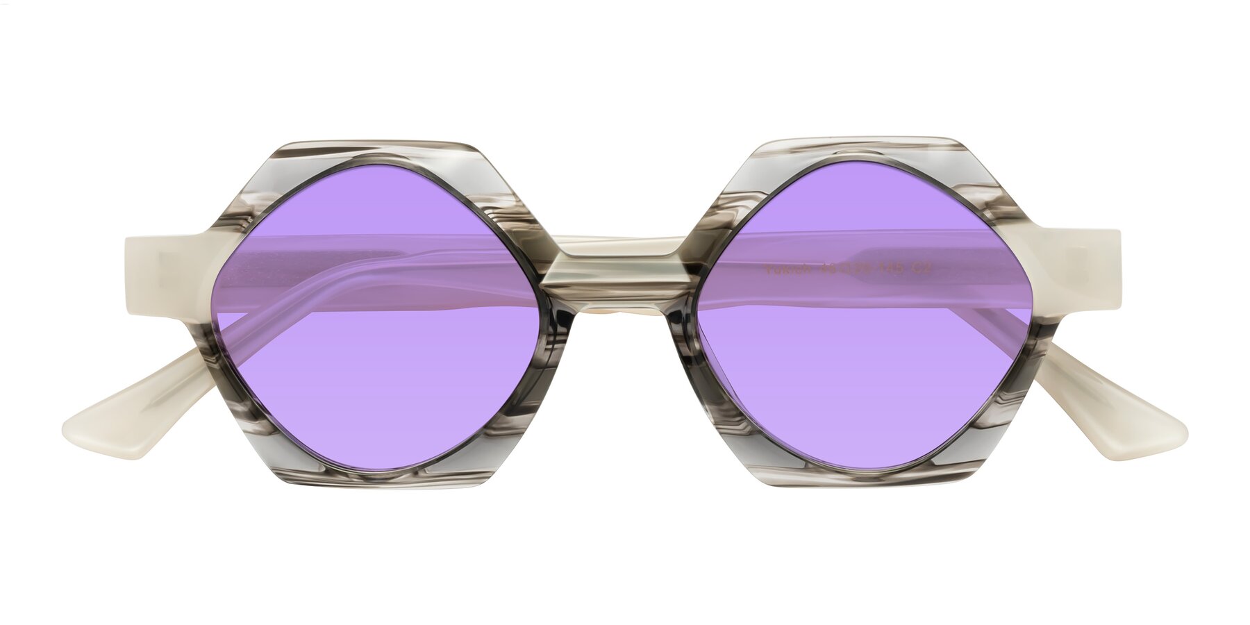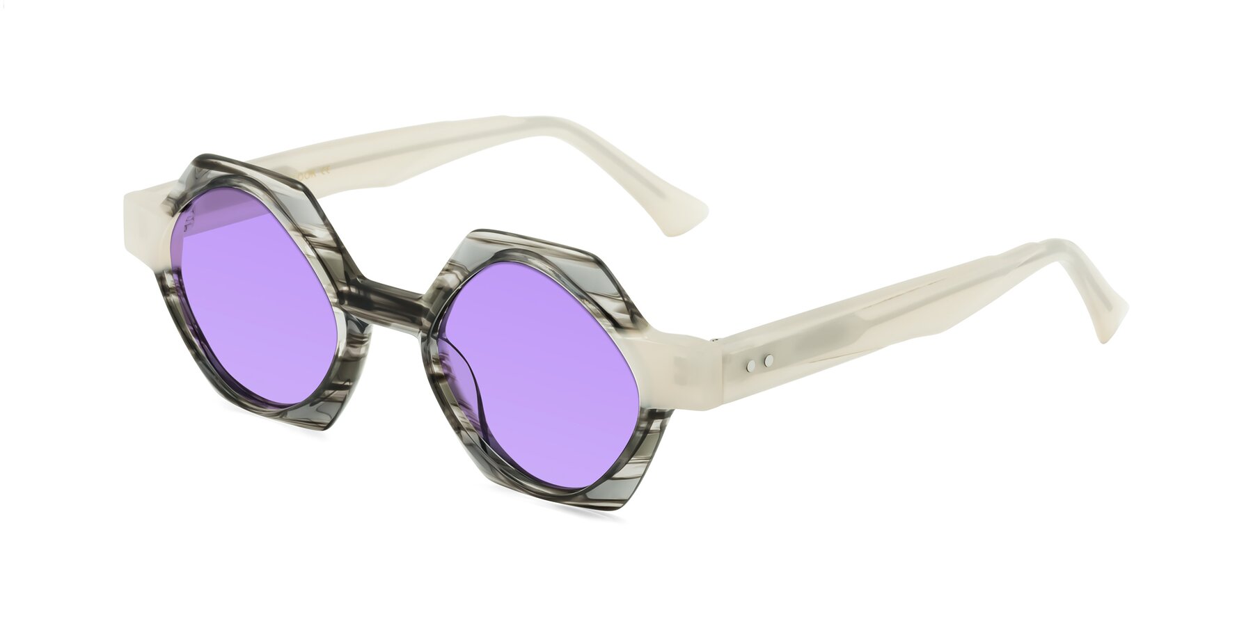 Gray Striped Designer Round Geometric Tinted Sunglasses with Medium Purple Sunwear Lenses