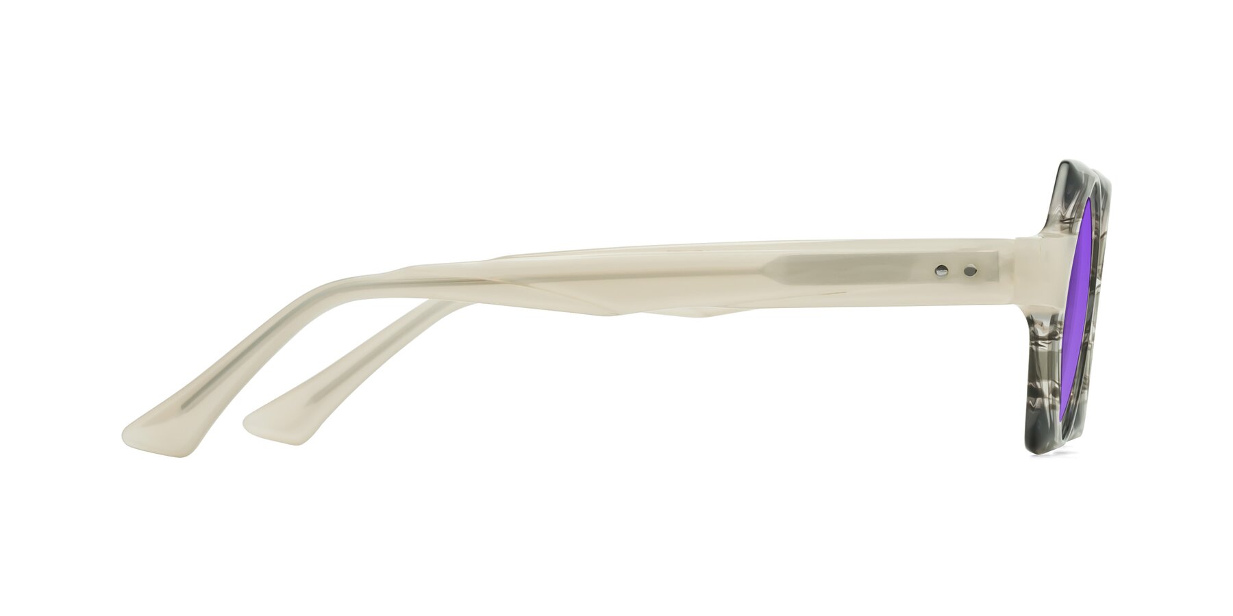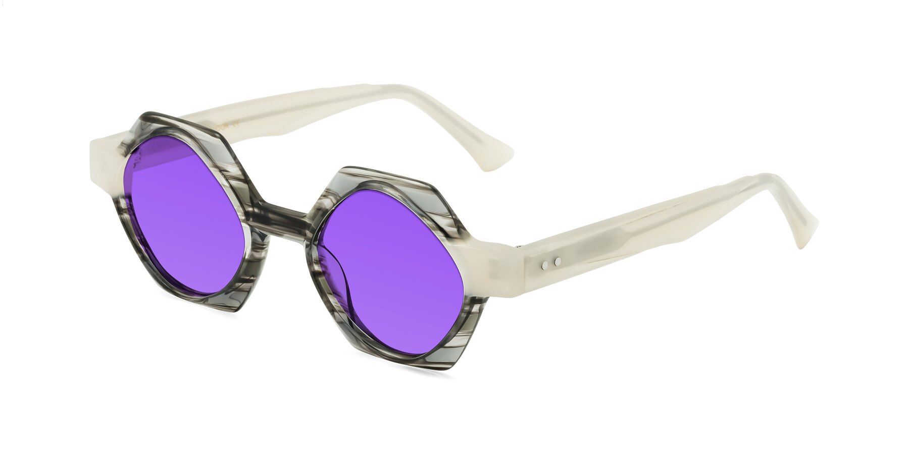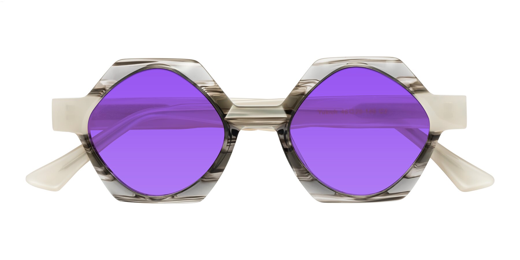 Gray Striped Designer Round Geometric Tinted Sunglasses with Purple Sunwear Lenses