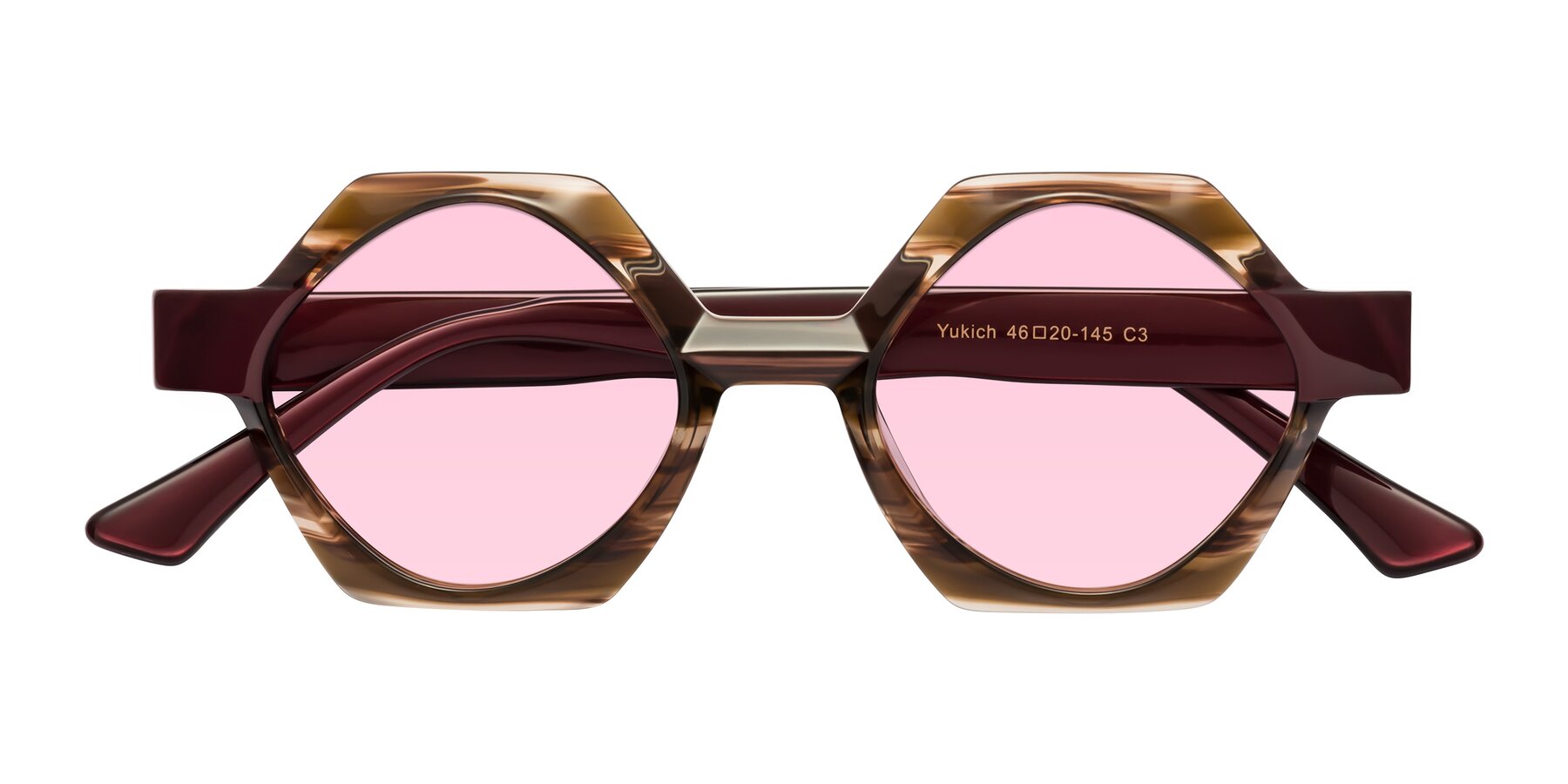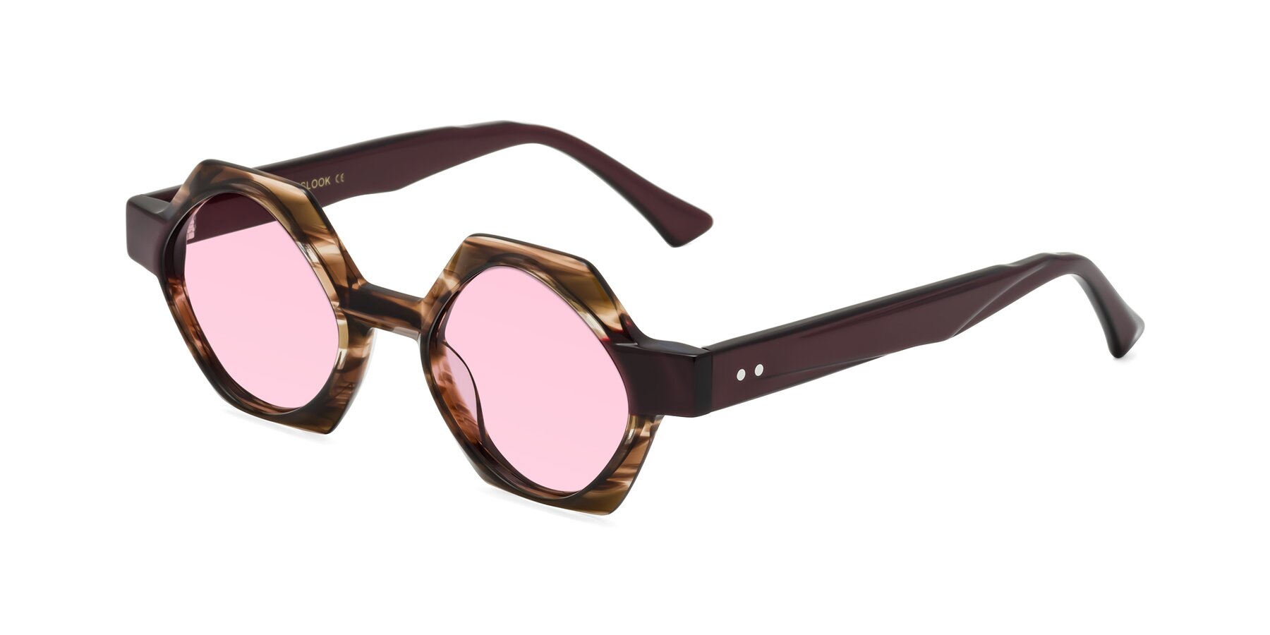 Brown Striped Designer Round Geometric Tinted Sunglasses with Light Pink Sunwear Lenses