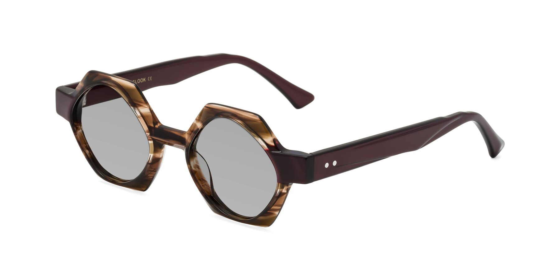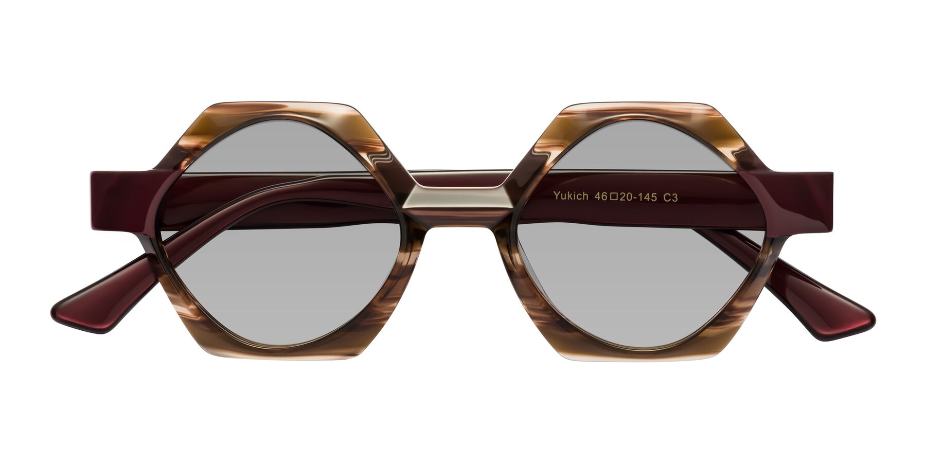 Brown Striped Designer Round Geometric Tinted Sunglasses with Light Gray Sunwear Lenses