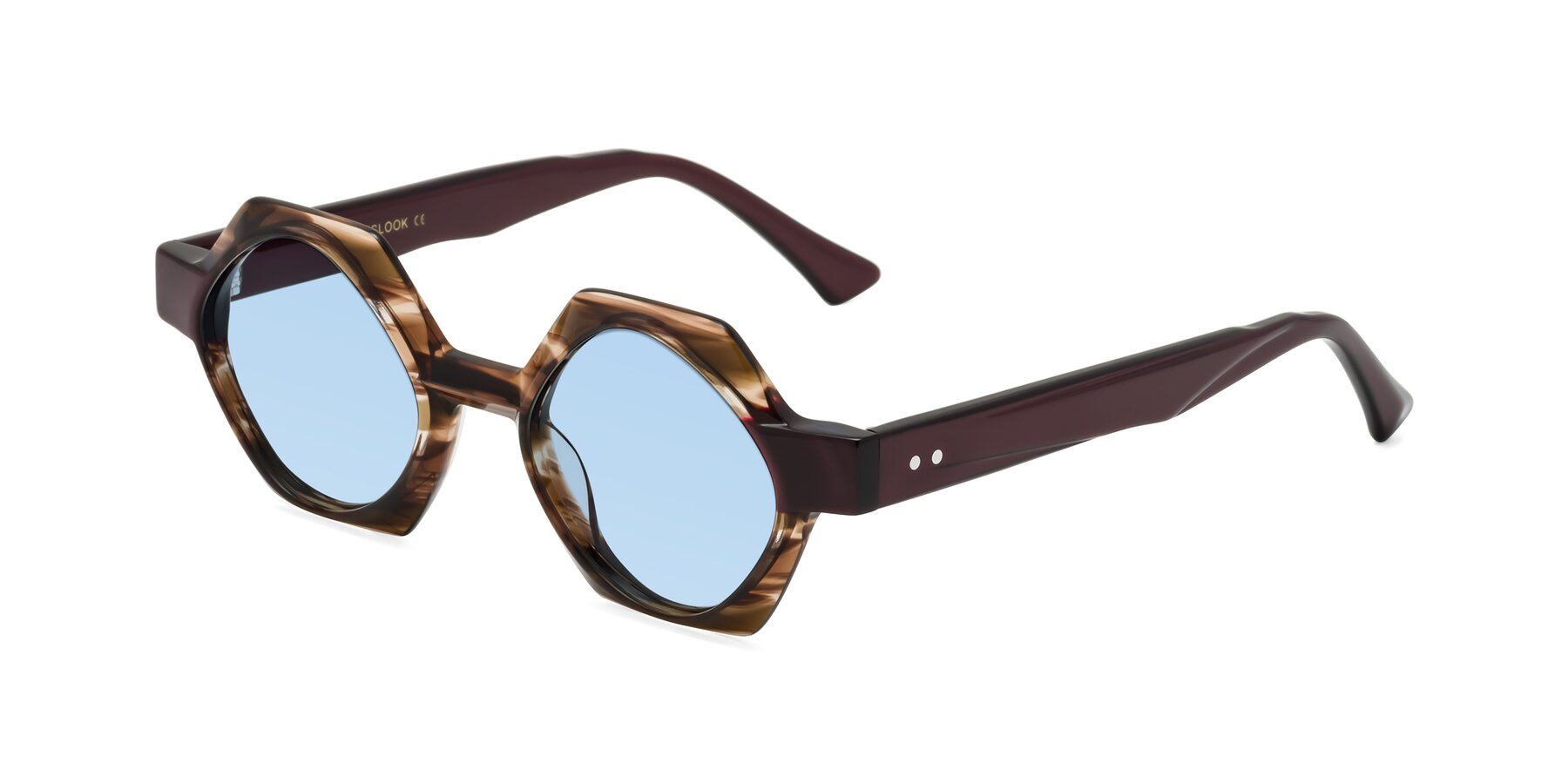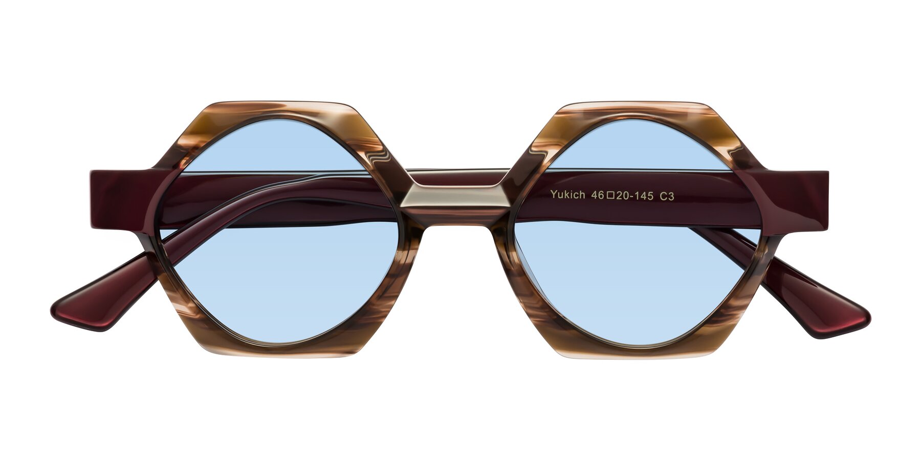 Brown Striped Designer Round Geometric Tinted Sunglasses with Light Blue Sunwear Lenses
