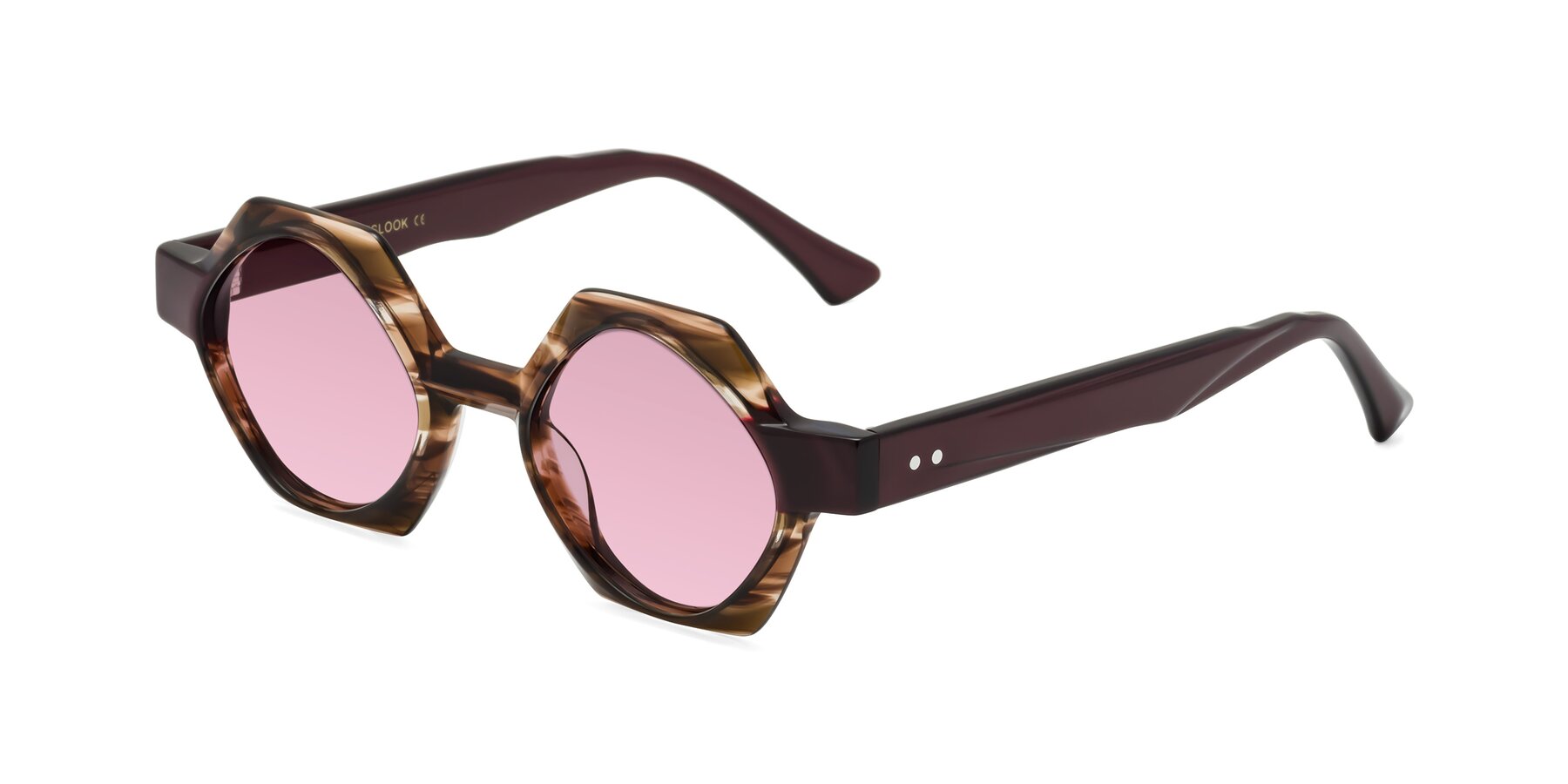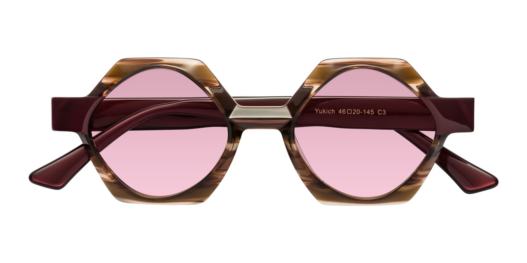 Brown Striped Designer Round Geometric Tinted Sunglasses with Light Wine Sunwear Lenses