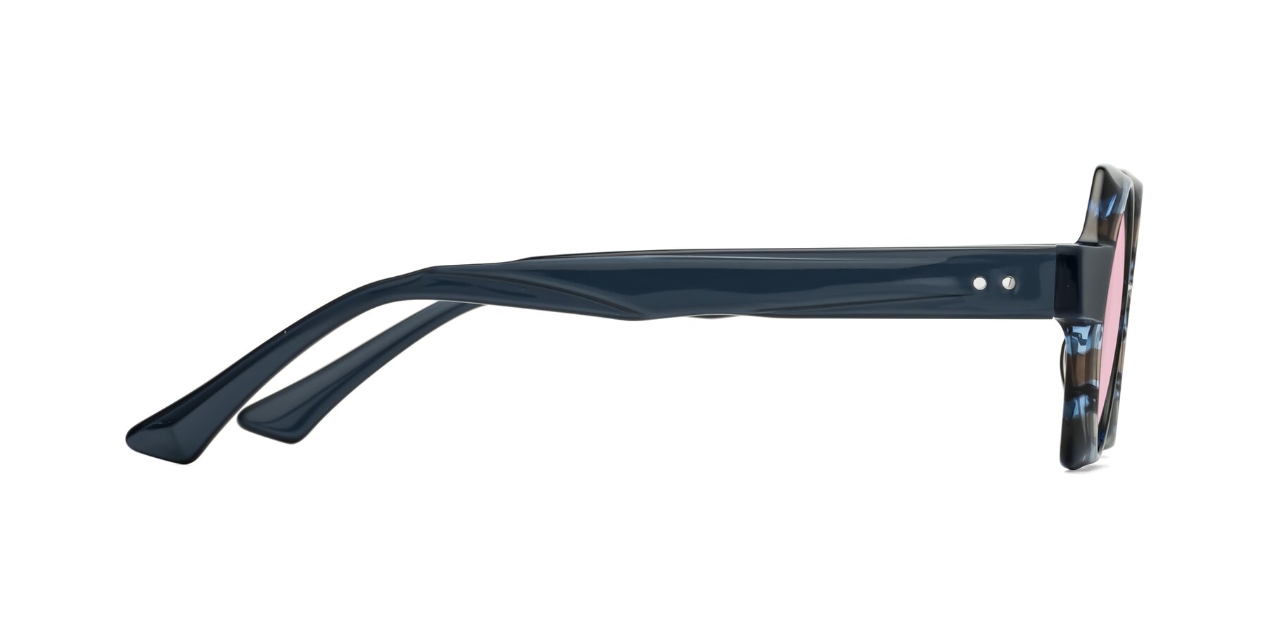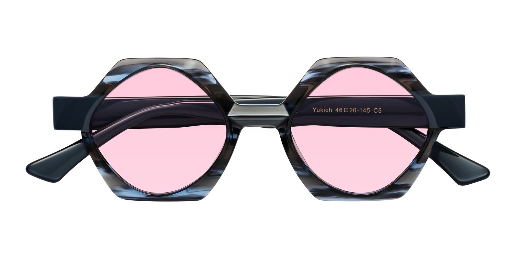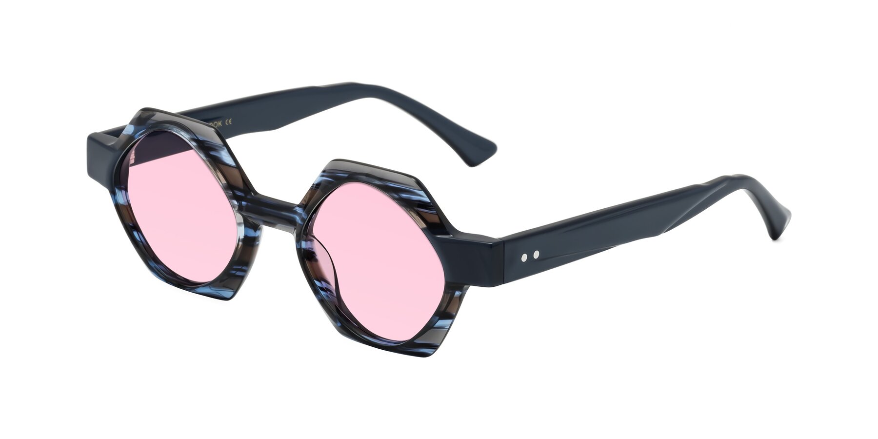 Blue Striped Designer Round Geometric Tinted Sunglasses with Light Pink Sunwear Lenses