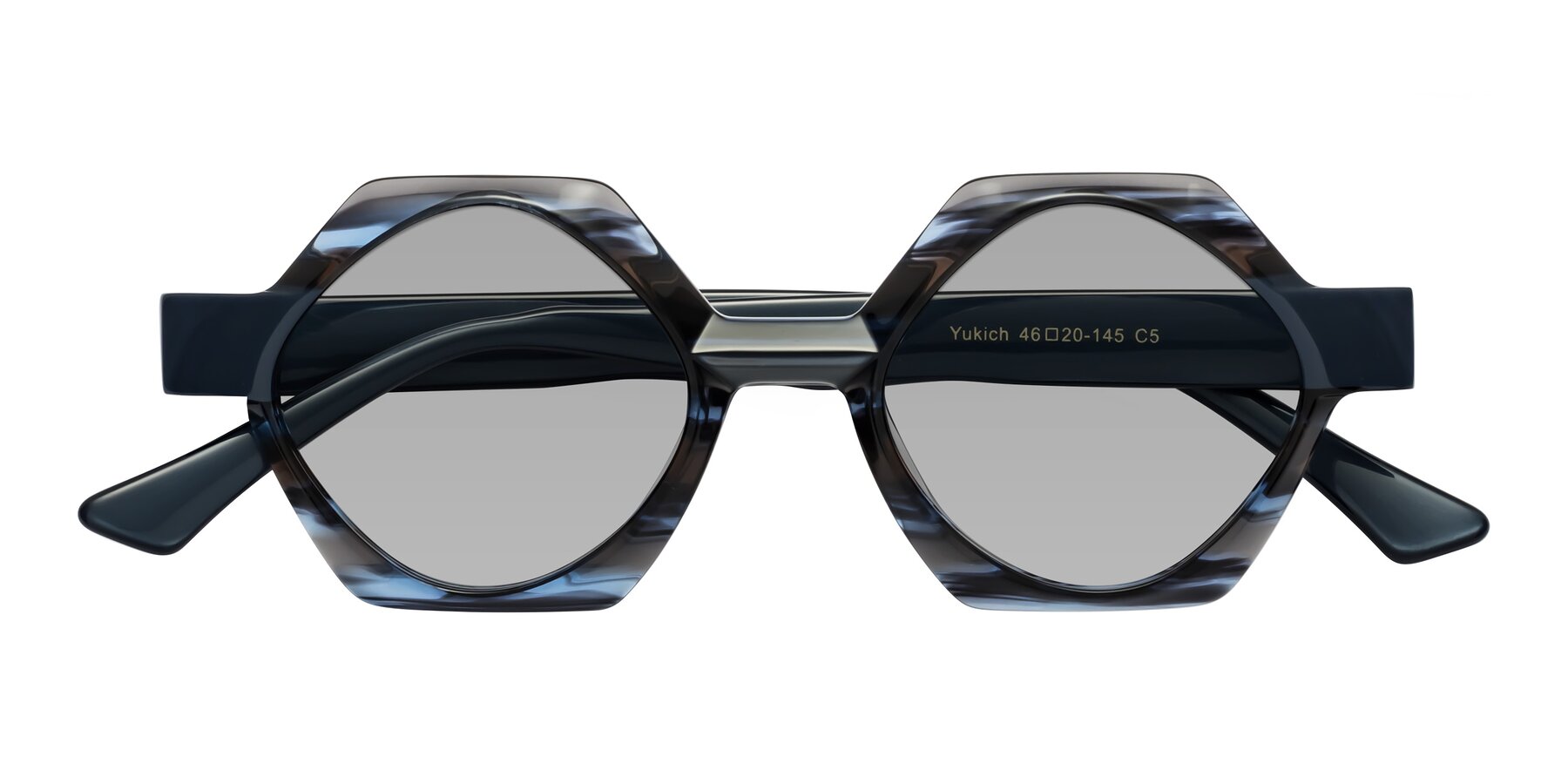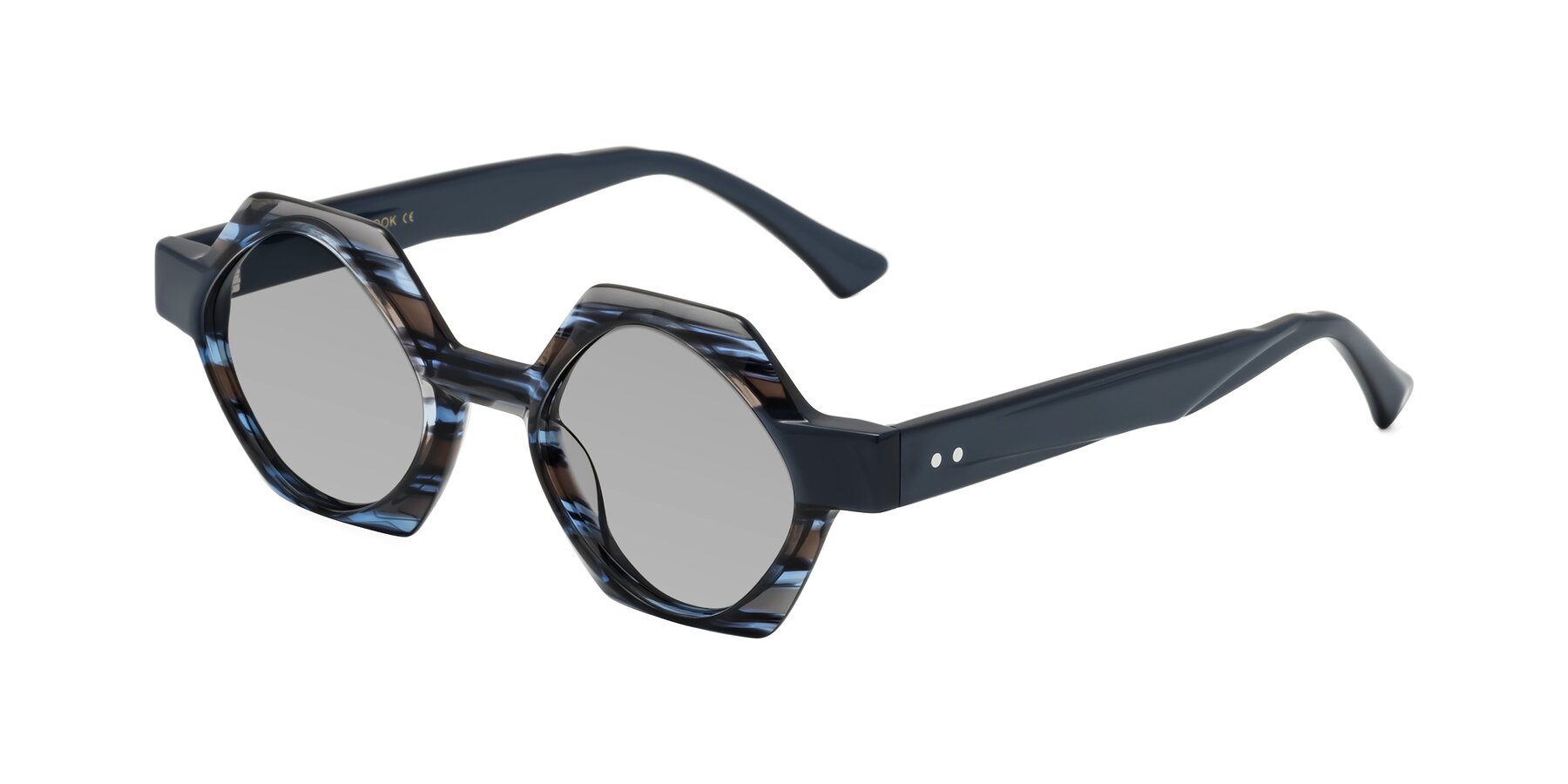 Blue Striped Designer Round Geometric Tinted Sunglasses with Light Gray Sunwear Lenses