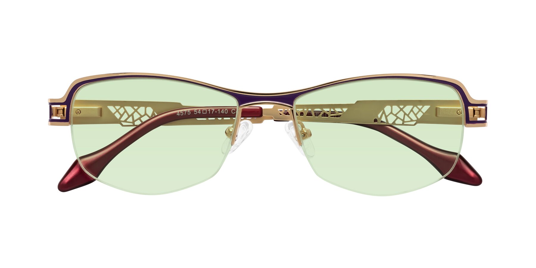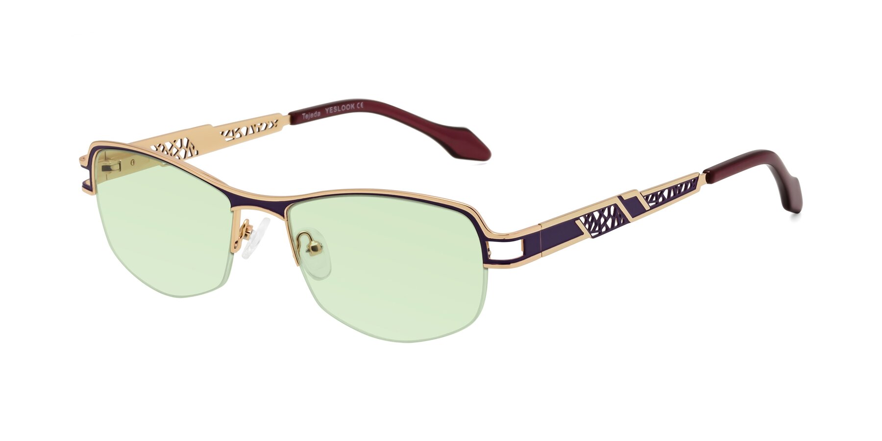 Gold/Purple Metal Geometric Semi-Rimless Tinted Sunglasses with Light Green Sunwear Lenses
